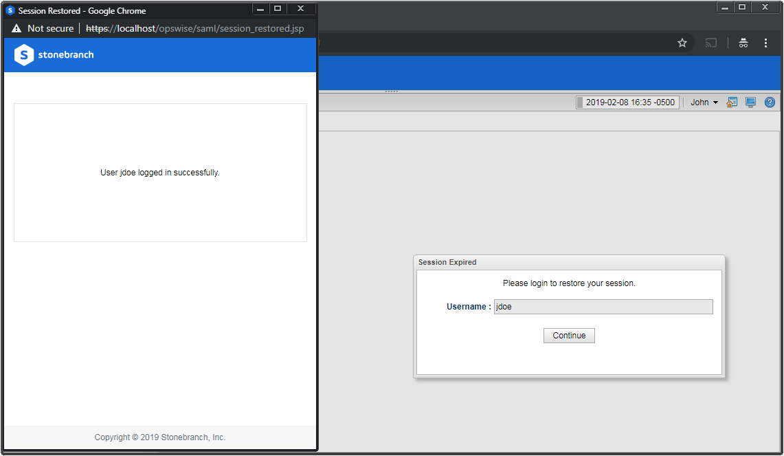 If only your Universal Controller session has expired, and not your session with the Identity Provider, you are logged in without being prompted for your credentials. Click Continue on the original dialog to proceed, which closes the SAML SSO authentication flow window.