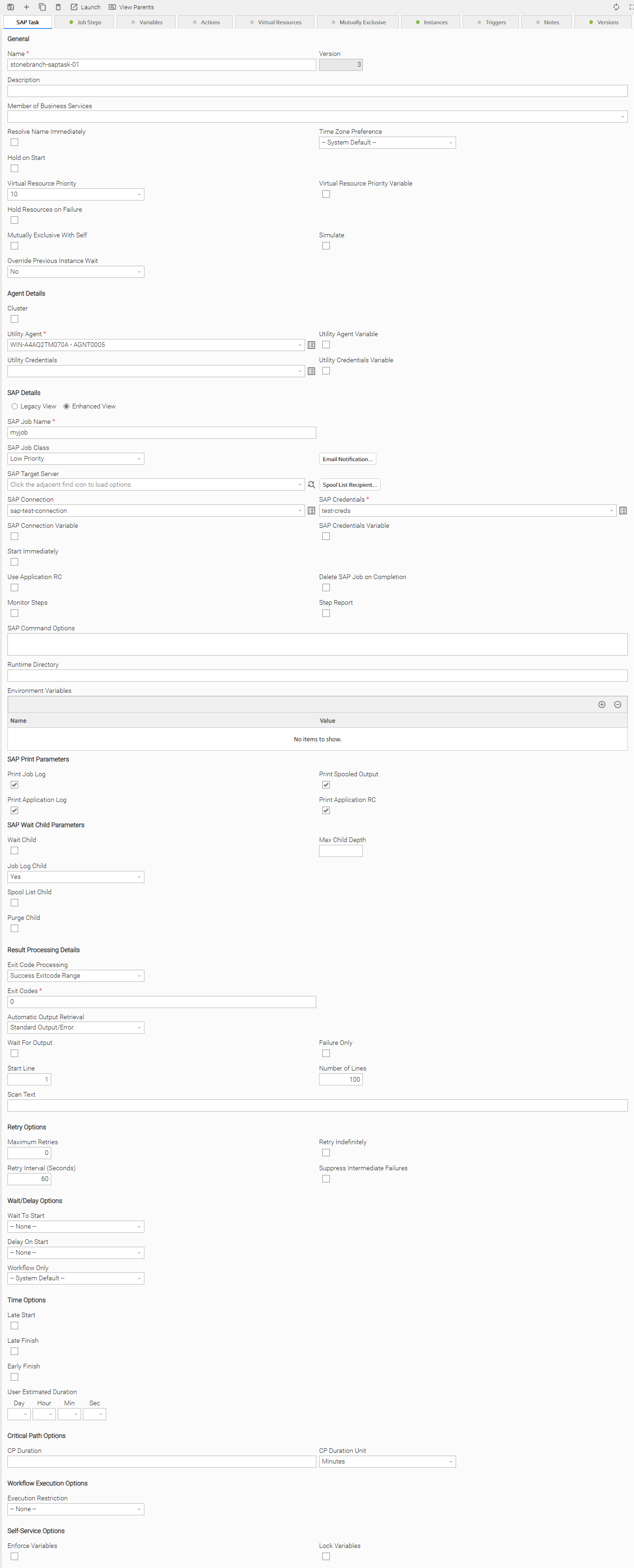 Depending on the values that you enter / select for these fields, whether or not the SAP task has ever been launched, and whether you have Enhanced View or Legacy View selected, more (or less) fields may display. See the field descriptions, below, for a description of all fields that may display in the SAP Task Details.