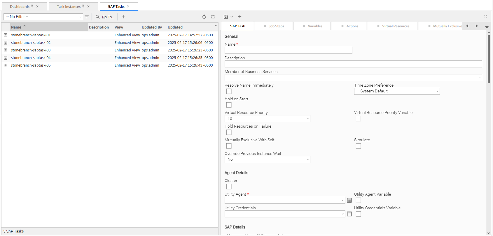 Step 1 | From the Automation Center navigation pane, select Tasks > SAP Tasks. The SAP Tasks list displays a list of all currently defined SAP tasks. To the right of the list, SAP Task Details for a new SAP task displays.