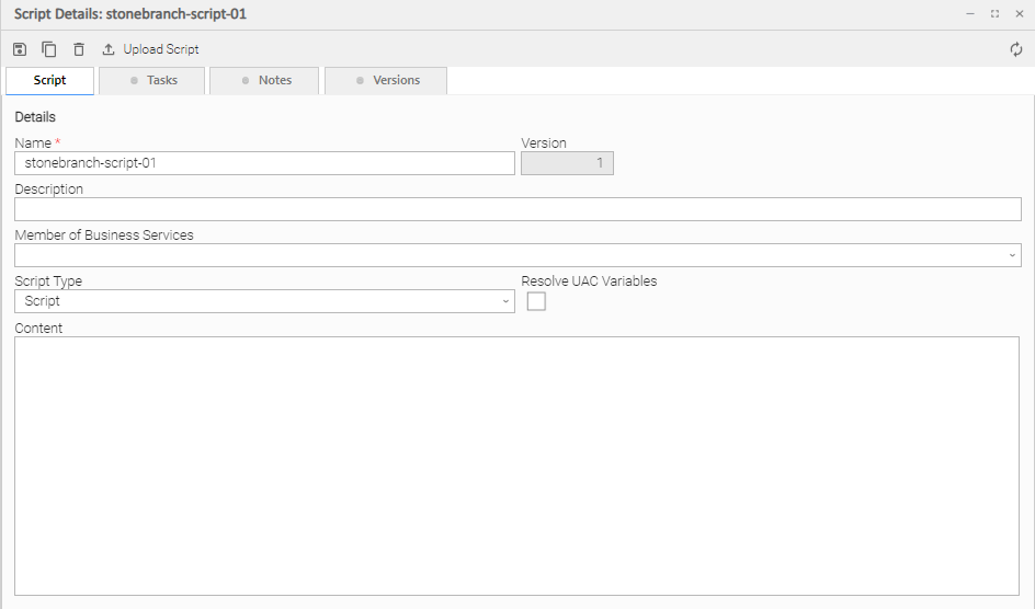 Allows you to upload a script from the local file system and place it in the Content field (see Uploading a Script, below).