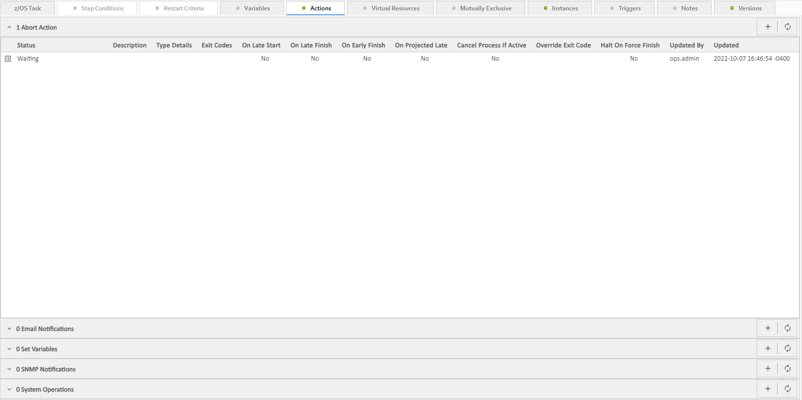 On Projected Late | Execute the Action when the task instance is projected to be late based on critical path projected end times. Only applicable when a Late Start Time, Late Start Duration, or Late Finish Time is specified for the task instance. info This field displays in the Details only if the Controller is configured for critical path calculations with an enabled Critical Path Calculations Permitted Universal Controller system property. |