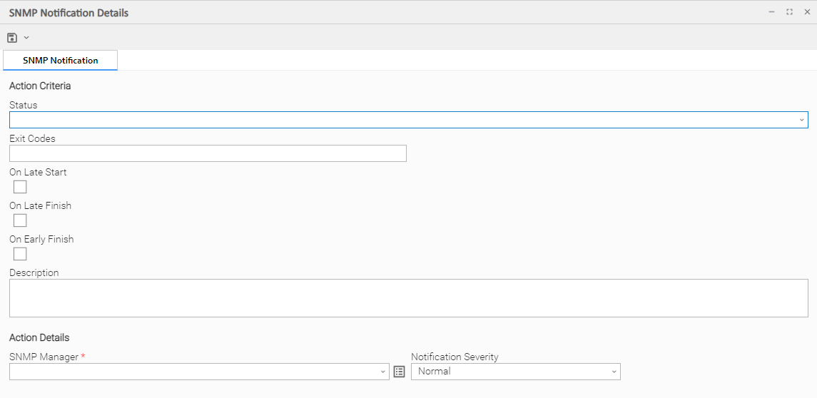SNMP Manager | The SNMP Manager that will receive the SNMP notification. Enter the name of an existing SNMP Manager, select an existing SNMP Manager from the drop-down list, or clear the SNMP Manager field and click the Details icon to create a new SNMP Manager. |