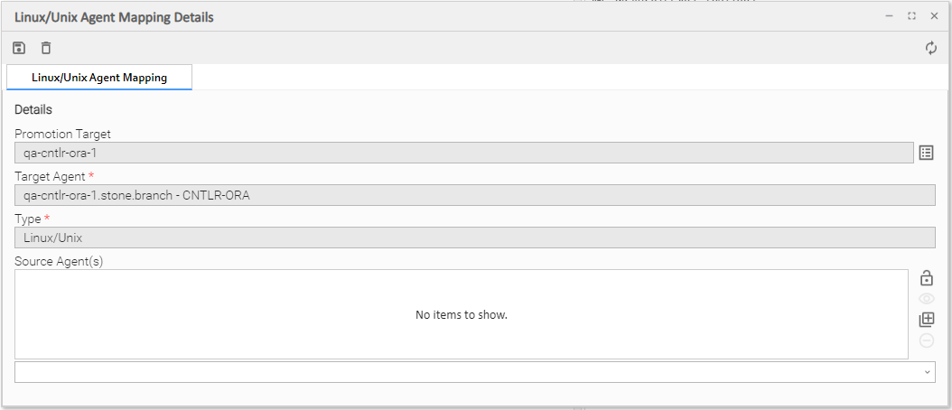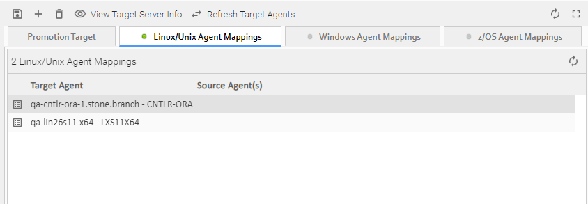 Step 5 | Open the Promotion Target record for which you have just refreshed Agents and click an Agent Mappings tab for which there are Agents on the target machine. The following example shows a list of Linux/Unix Agents on a target machine:
