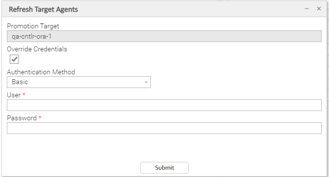 Step 4 | Click Submit. The Controller logs in to the target machine specified in the Promotion Target record URI field, accesses the appropriate tables, sorts the Agents into Agent types, and lists them in the appropriate <Agent-type> Mappings tab of the Promotion Target record. |