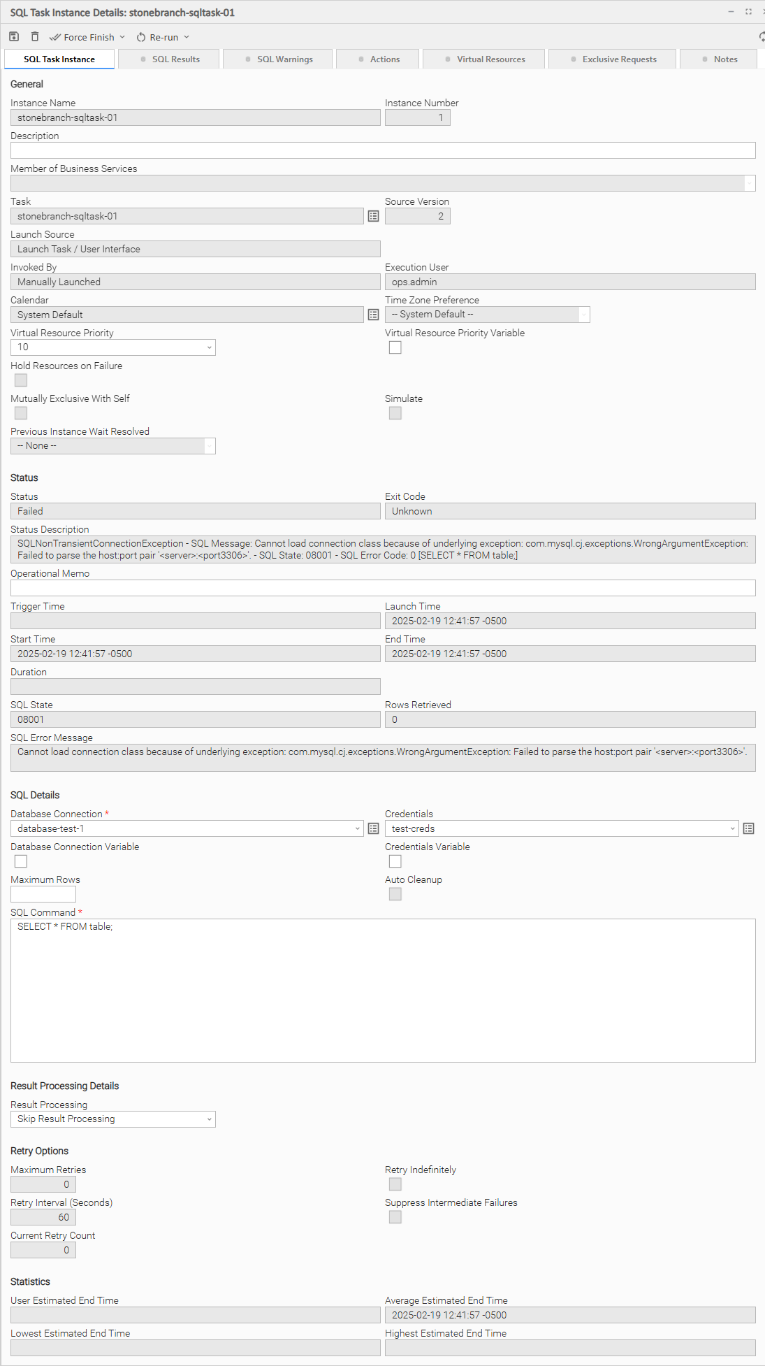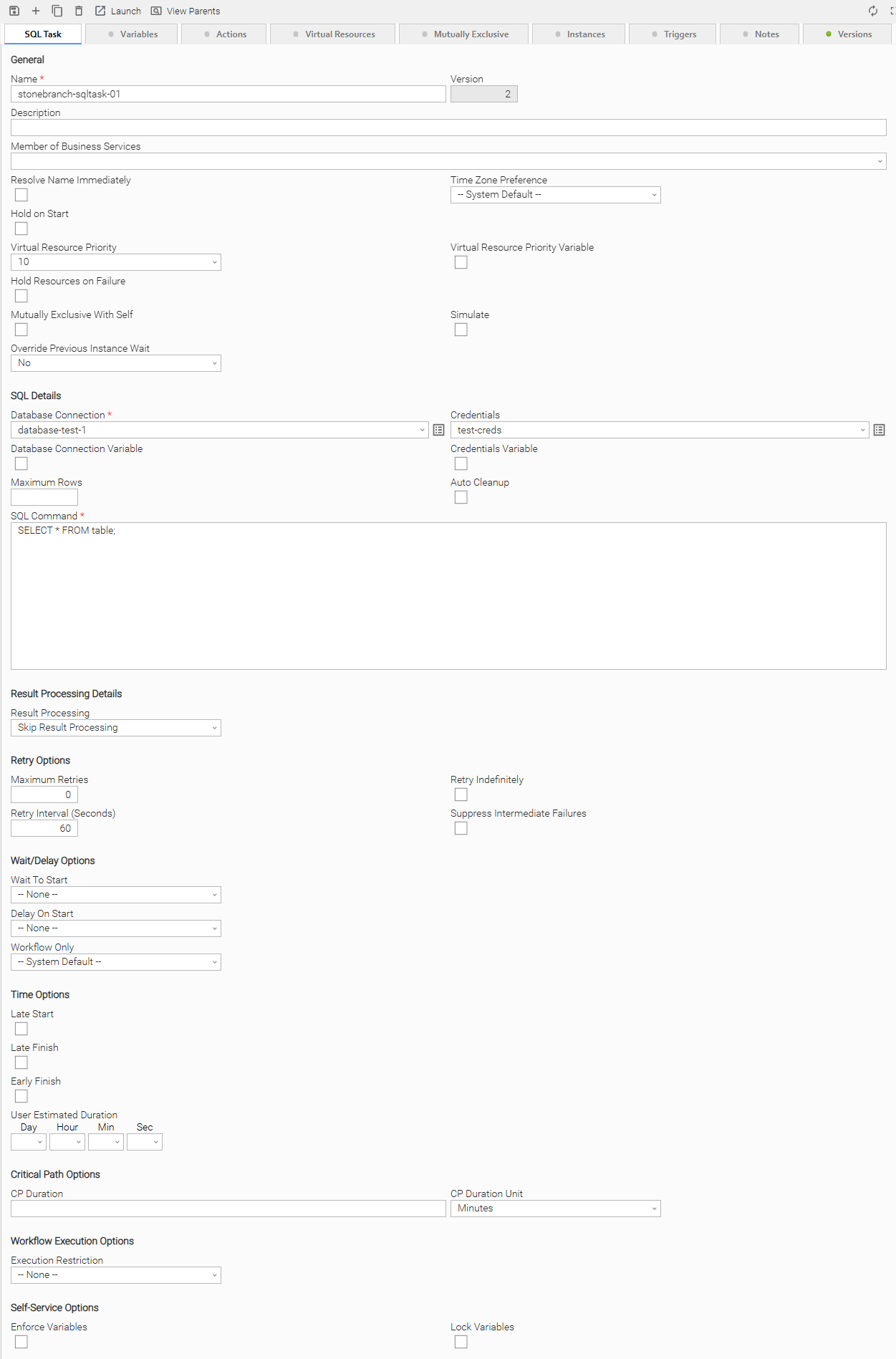 Depending on the values that you enter / select for these fields, and whether or not the SQL task has ever been launched, more (or less) fields may display. See the field descriptions, below, for a description of all fields that may display in the SQL Task Details.