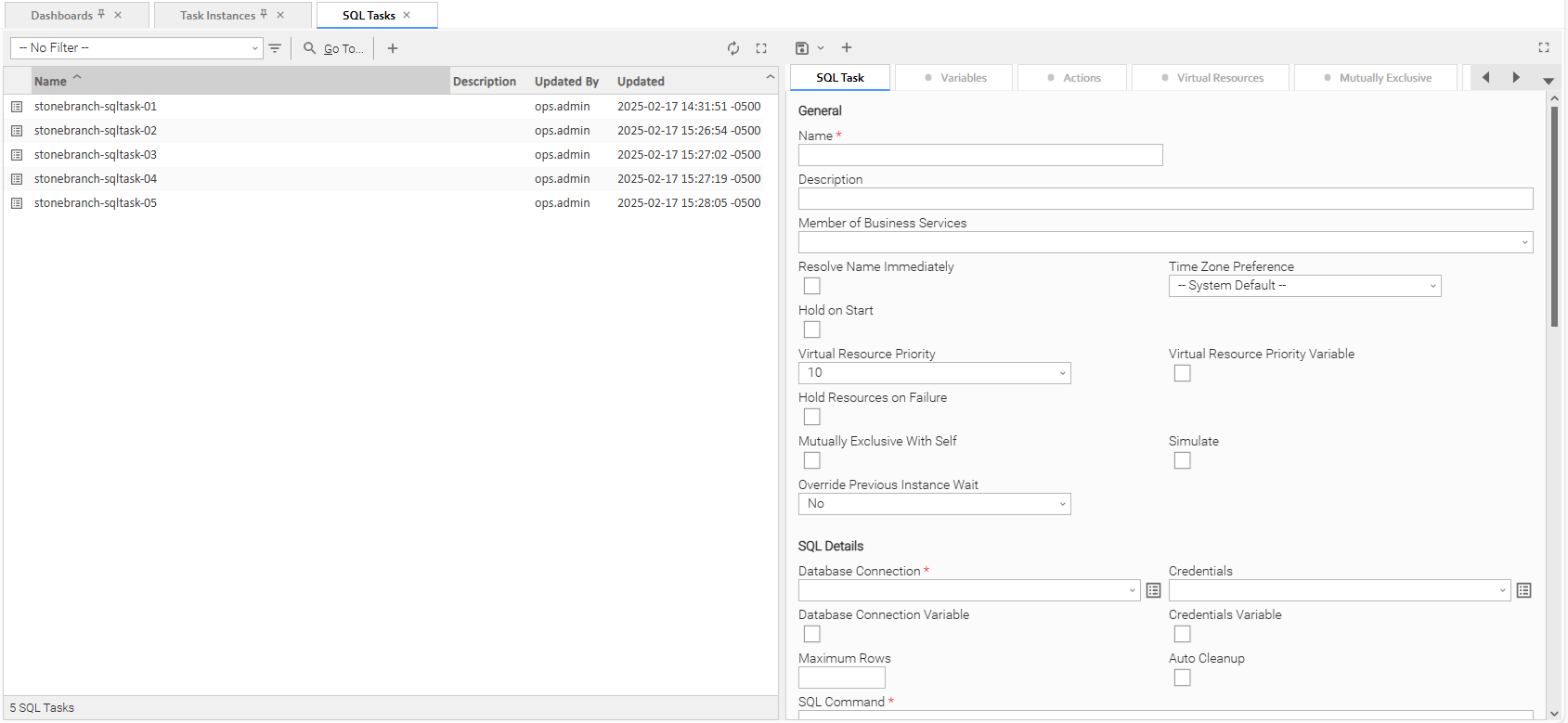 From the Automation Center navigation pane, select Tasks > SQL Tasks. The SQL Tasks list displays a list of all currently defined SQL tasks.