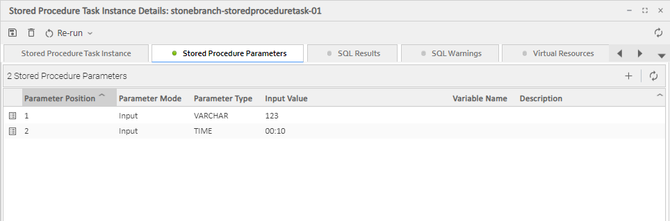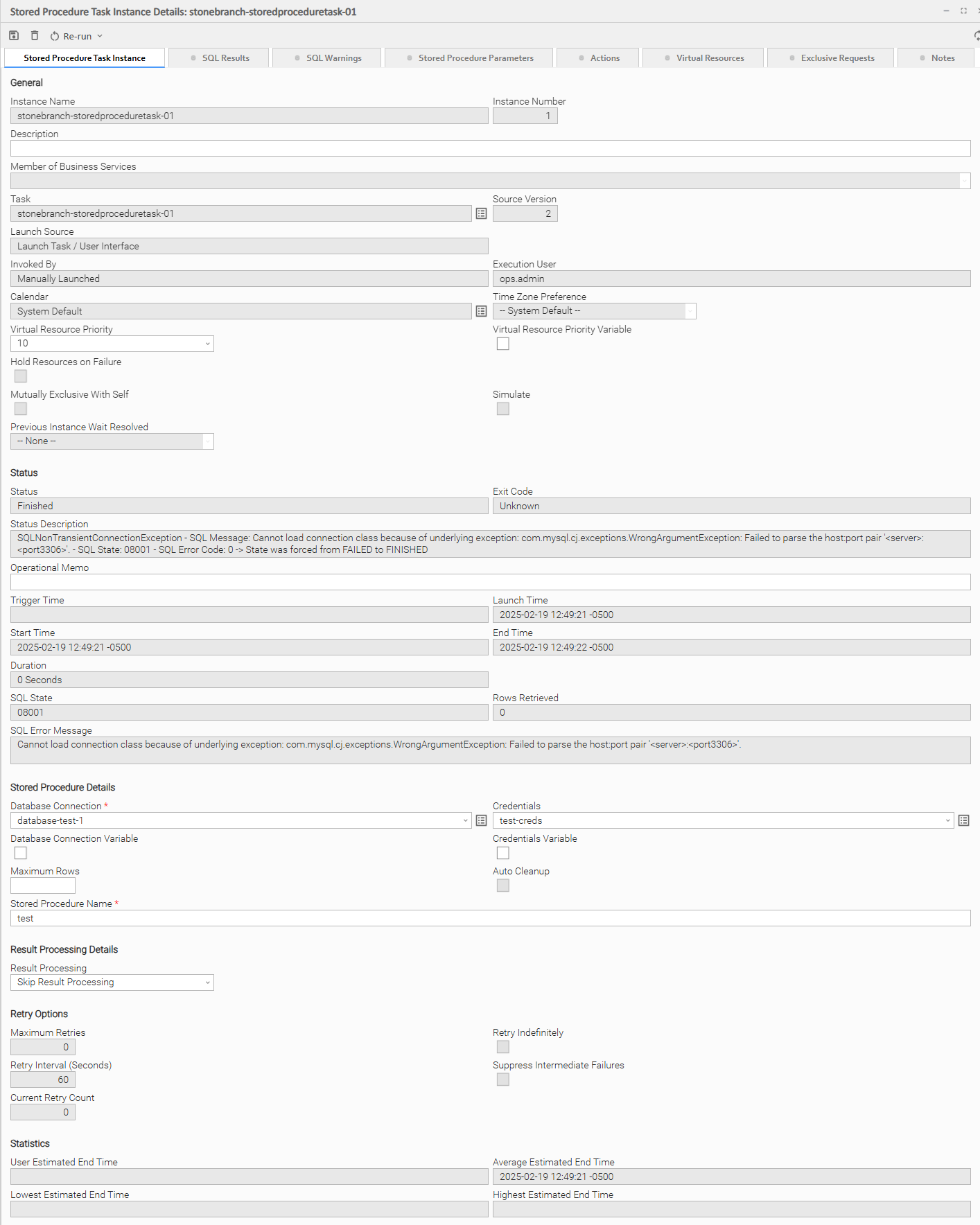The following Stored Procedure Task Instance Details contains information on the execution of the task shown in the Stored Procedure Task Details.