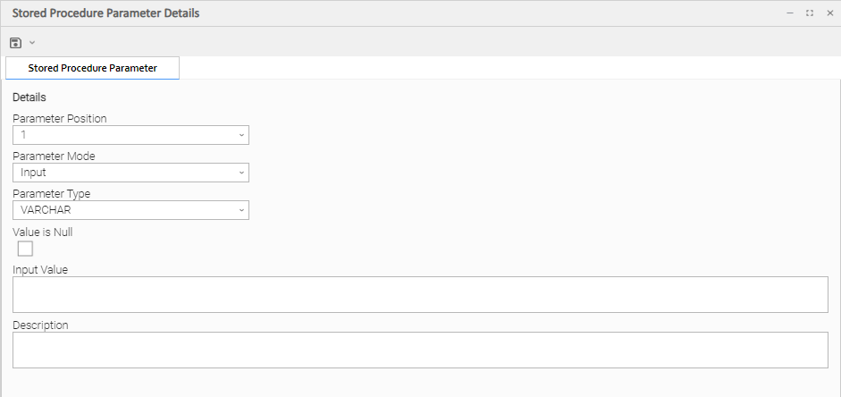 Value is Null | If Parameter Mode = Input or Input/Output; Value for the parameter is a database NULL value; applies to the input part of a stored procedure parameter. That is, if a value in a database is undefined, it is NULL, which means it has no set value. An input value can be NULL and is represented by selecting Value is Null. |