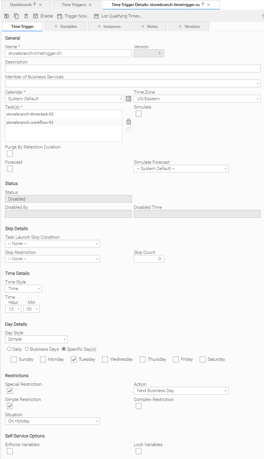 Special Restriction | Enable this field in order to specify additional parameters that tell the Controller how to handle exceptions, such as when the trigger is satisfied on a holiday or non-business day. You can specify simple and/or complex restrictions. For example, you can specify a Simple Restriction that disables the trigger if it is satisfied on a holiday identified in the calendar and/or a Complex Restriction that disables the trigger on the last business day of every month. |