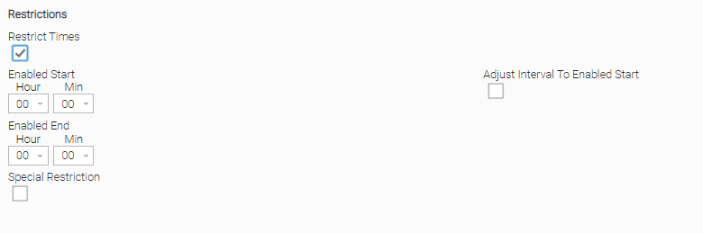 Adjust Interval To Enabled Start | If Restrict Times is enabled; Specification for whether to always begin at the Enabled Start, regardless of the time interval, or to begin based on the actual interval. If Adjust Interval To Enabled Start is not selected, the start time and end time specify only the time frame/window during which the trigger is active; they do not modify the actual time interval (see Restrict Times). |