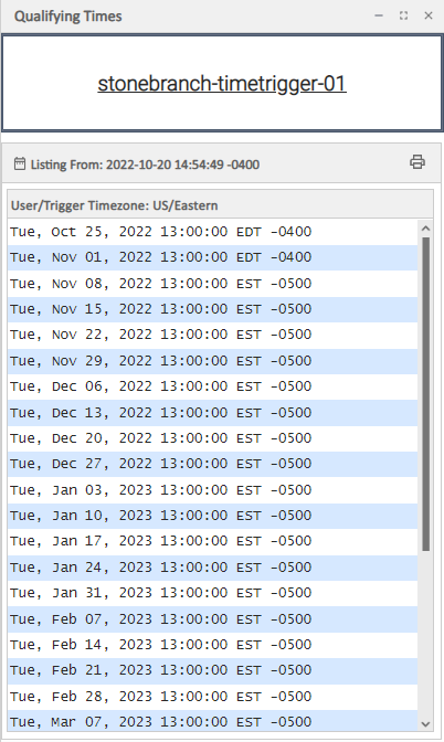 List Qualifying Times | Lets you generate a list of future dates and times that the trigger will trigger the specified task (see Generating a List of Qualifying Times, below). |