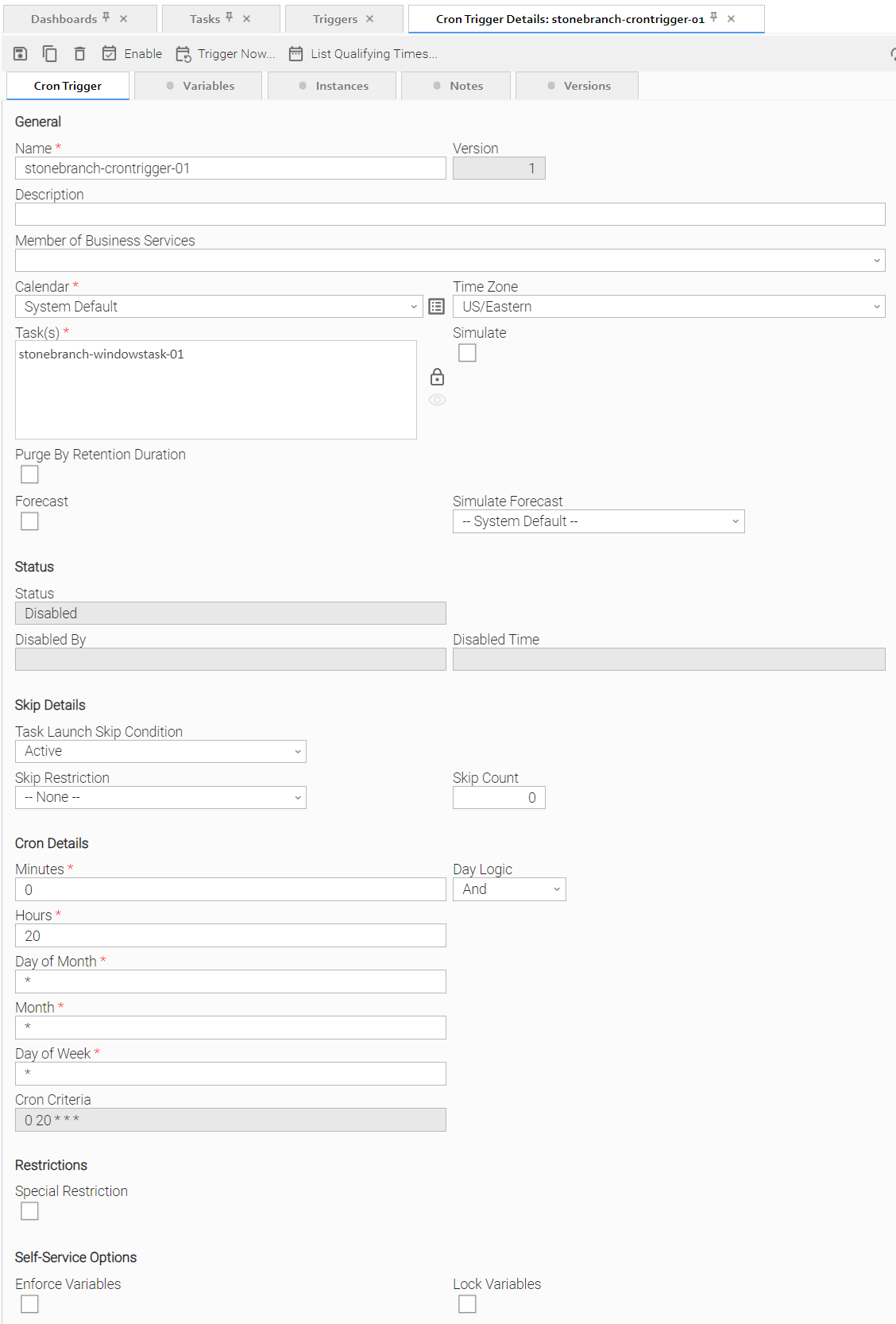 User-defined; indication of whether the trigger is enabled (checked) or disabled (not checked). The user enables and disables the trigger by clicking the Enable Trigger / Disable Trigger buttons. Only enabled triggers are processed by the Controller.