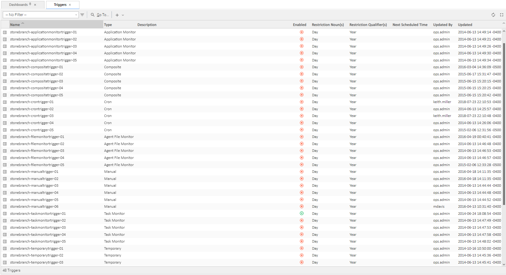 To display a list of all currently defined triggers for all trigger types, from the Automation Center navigation pane select Triggers > All Triggers. The All Triggers list displays.