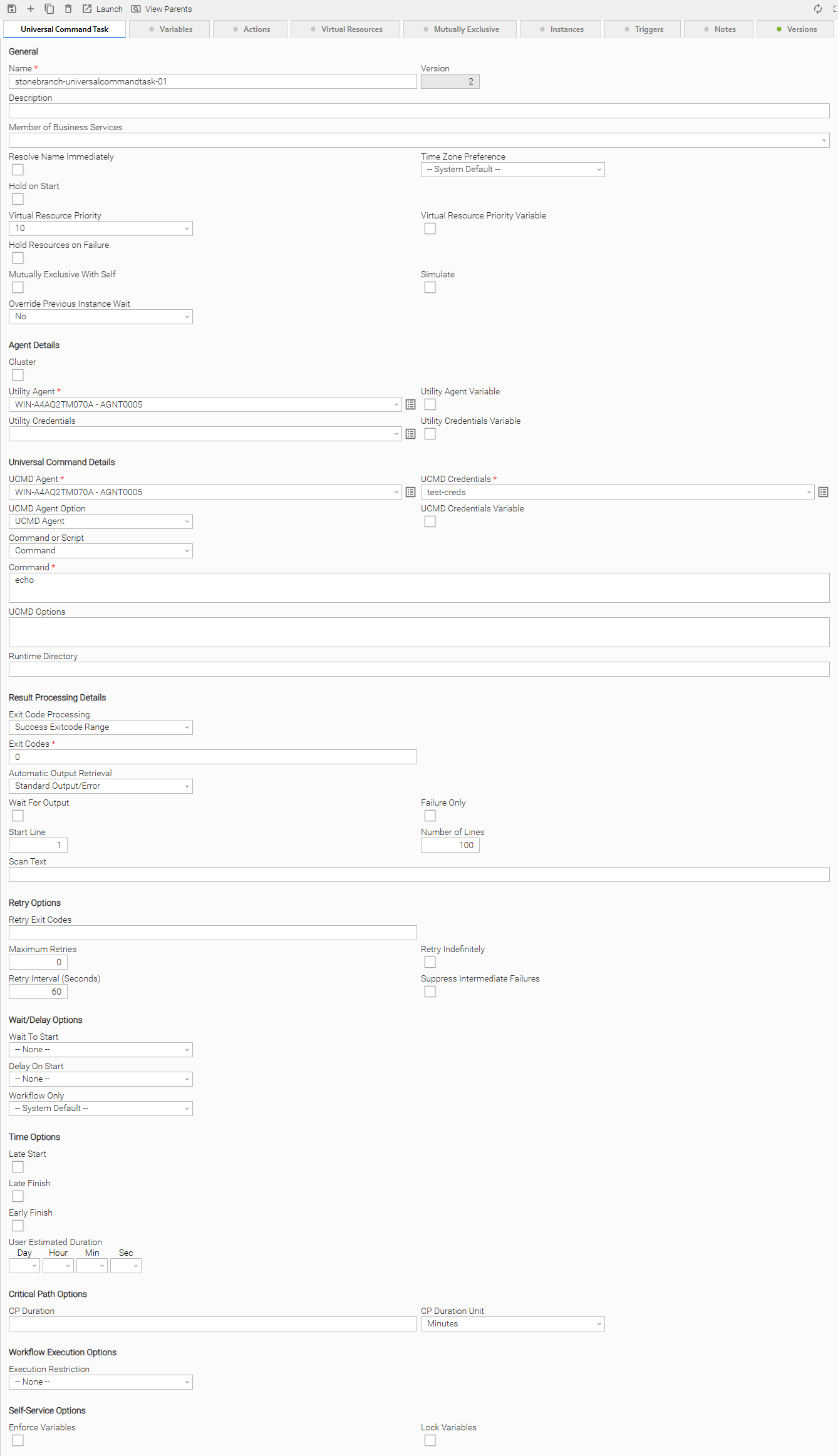 Depending on the values that you enter / select for these fields, and whether or not the Universal Command task has ever been launched, more (or less) fields may display. See the field descriptions, below, for a description of all fields that may display in the Universal Command Task Details.