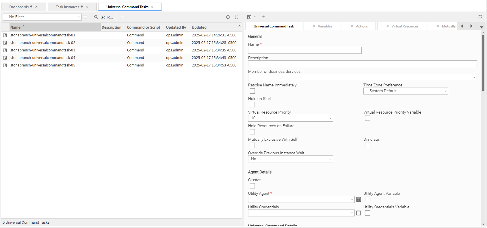 Step 1 | From the Automation Center navigation pane, select Tasks > Universal Command Tasks. The Universal Command Tasks list displays a list of all currently defined Universal Command tasks. To the right of the list, Universal Command Task Details for a new Universal Command task displays.