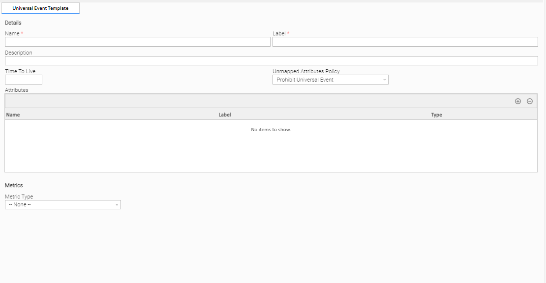 Metric Label Attributes | Specifies a comma-delimited list of universal event attribute names to use for metric labels. For example, At most 8 label attributes can be specified. warning Do not specify attributes with high cardinality (many different attribute values) or attributes that may contain sensitive information. |