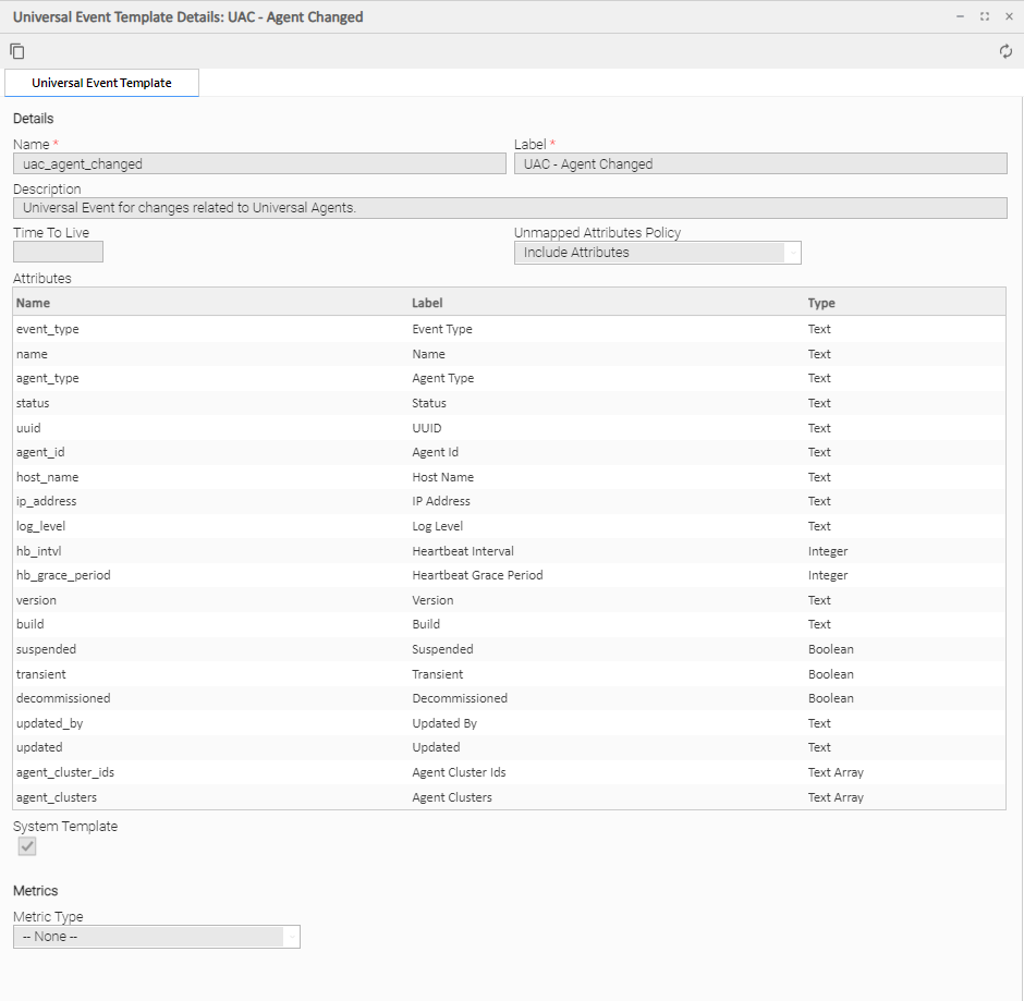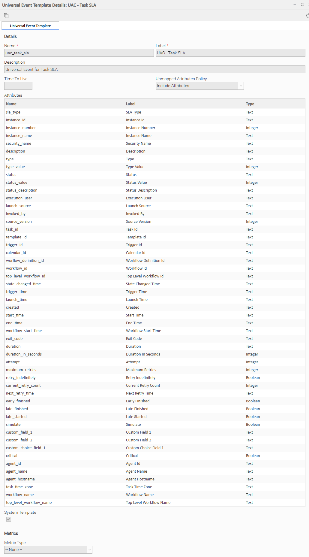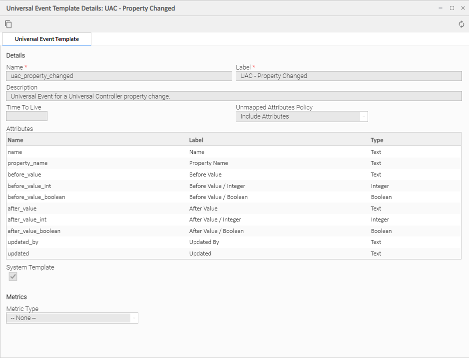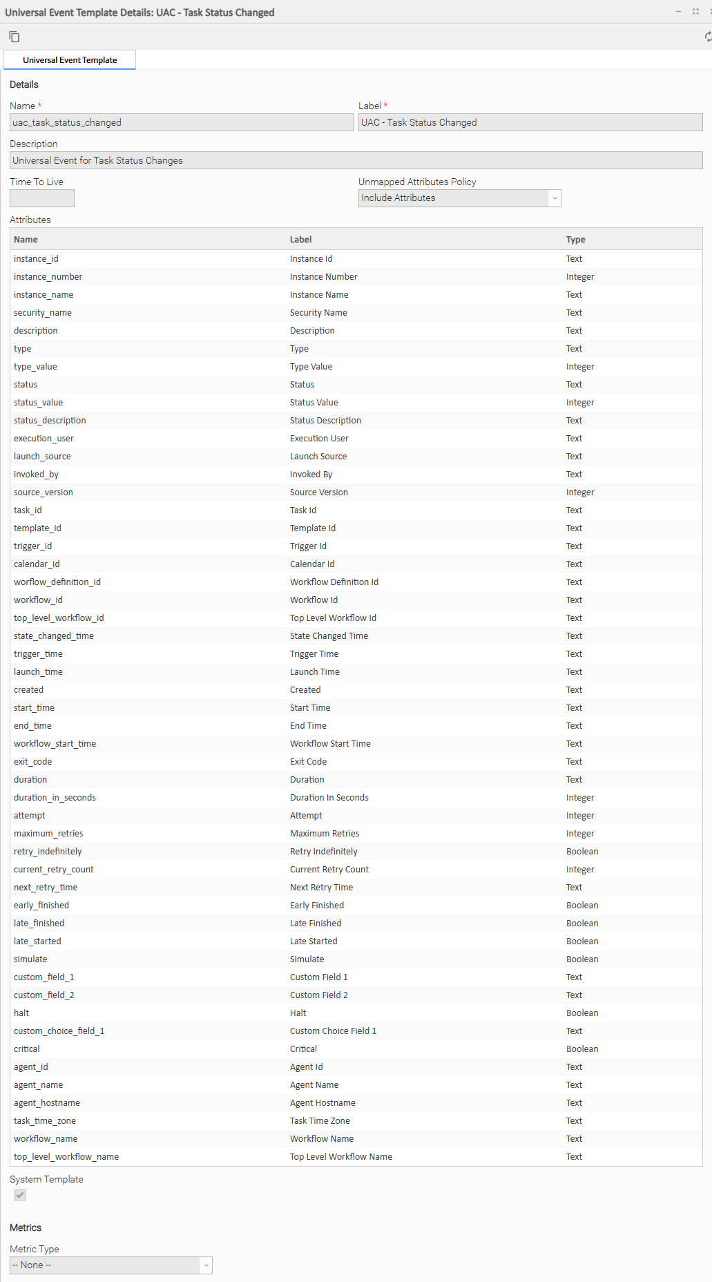 Details | This section contains assorted detailed information about a Universal Event Template. |
