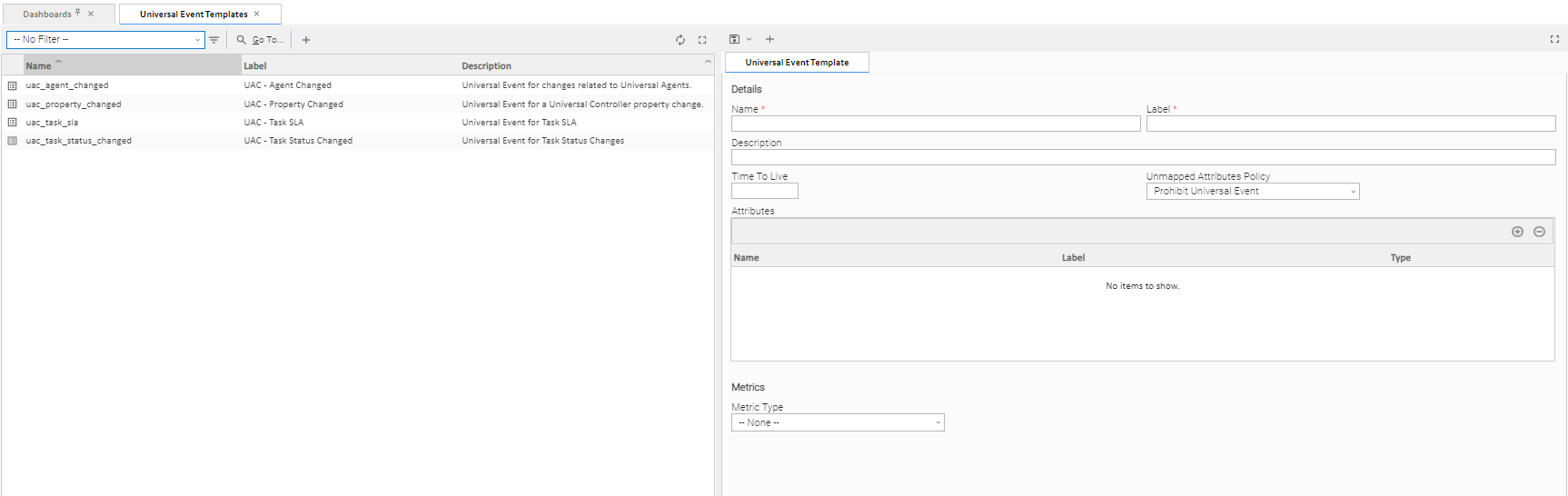 Step 1 | From the Automation Center navigation pane, select Configuration > Universal Event Templates. The Universal Event Templates list displays a list of all existing Universal Event Templates. Below the list, Universal Event Template Details for a new Universal Event Template displays.