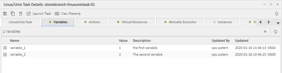 You define Local variables (variables specific to a single trigger, task, or workflow) on the Variables tab in the Details of that trigger, task, or workflow. These variables are stored in the ops_local_variable table.