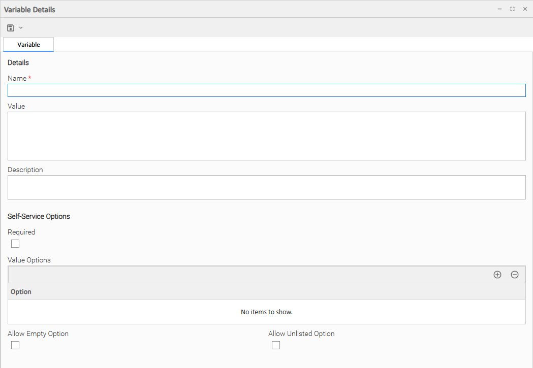 Required | Specifies that the Trigger Now... and Launch With Variables... command dialogs require the user to specify a non-blank value for the variable. If true, the variable cannot be removed in the Launch with Variables... or Trigger Now... command dialogs, and the variable name will be read-only. Required cannot be enabled if Allow Empty Option is enabled. |