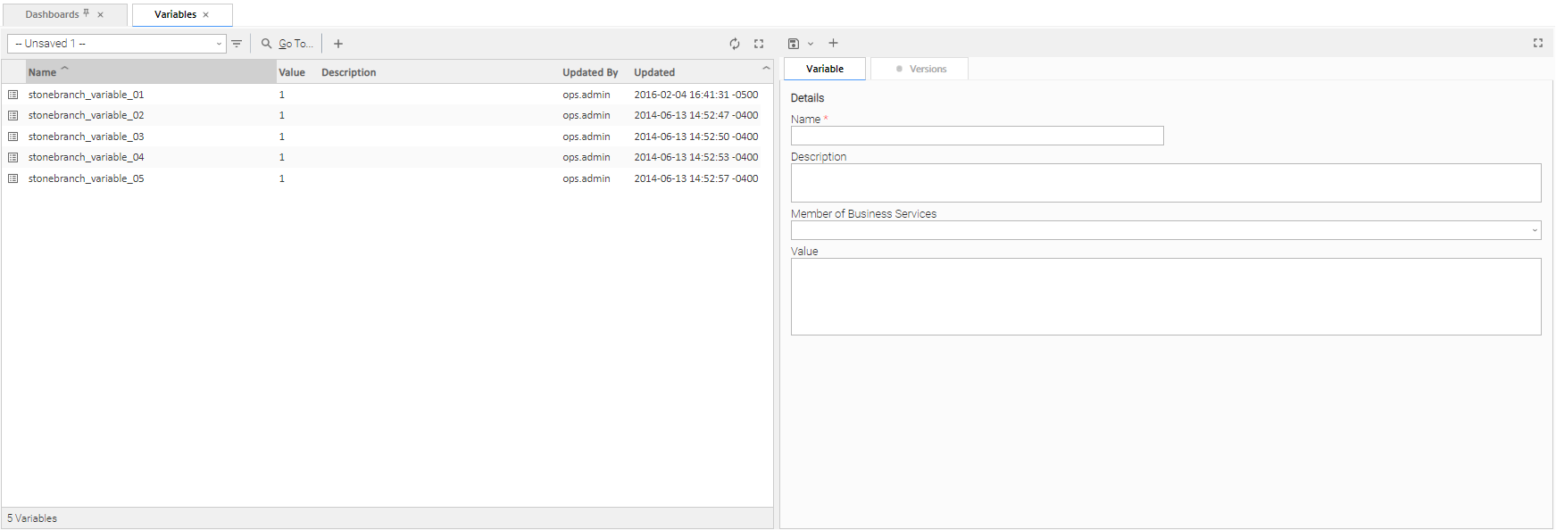 Step 1 | From the Automation Center navigation pane, select Other > Variables. The Variables list displays a list of all Global variables. (You also can define a Global variable by using the Set Variable action for a task or workflow.) To the right of the list, Variable Details for a new Global variable displays.