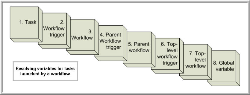 - If that trigger does not define the variable, it checks for variables associated with the workflow. (This continues until the top level workflow is reached.)