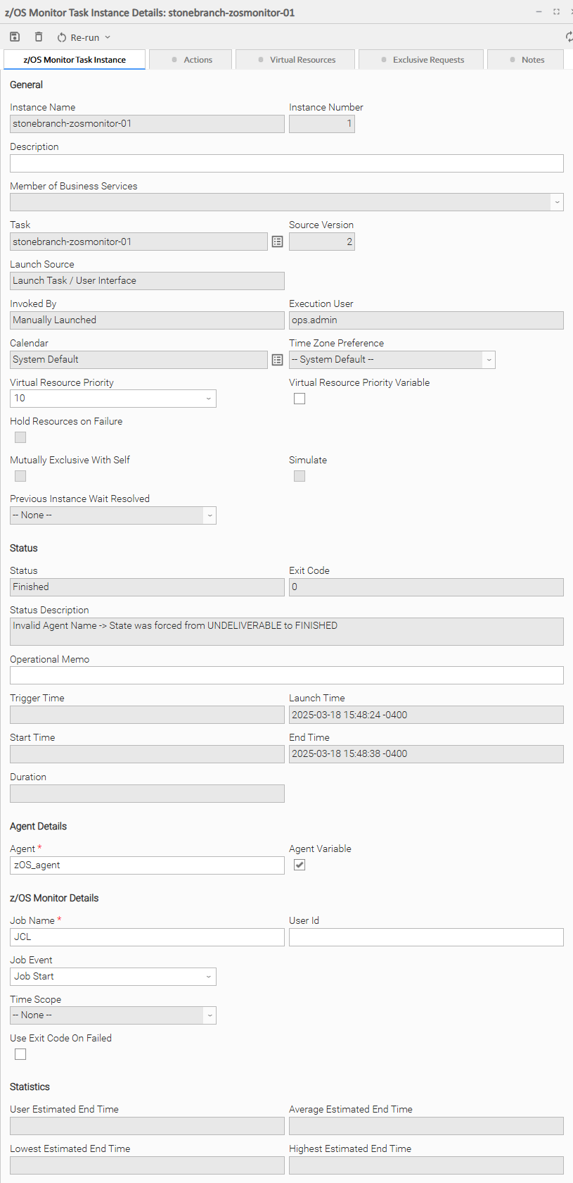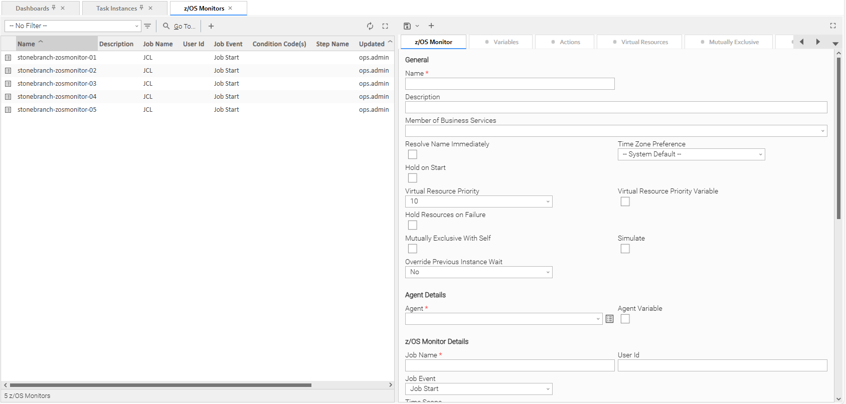 The following z/OS Monitor Task Details is for an existing z/OS Monitor task.