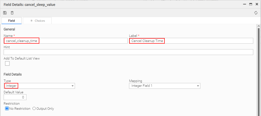 In the "Fields" tab, add a new field called "cancel_cleanup_time" as shown below: