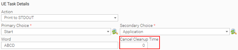 • Navigate to the "ue-task-test" task instance form, and ensure the Cancel Cleanup Time field is set to 0 as shown: