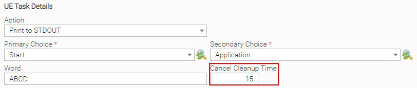 • Navigate to the "ue-task-test" task instance form, and ensure the Cancel Cleanup Time field is set to 15 as shown: