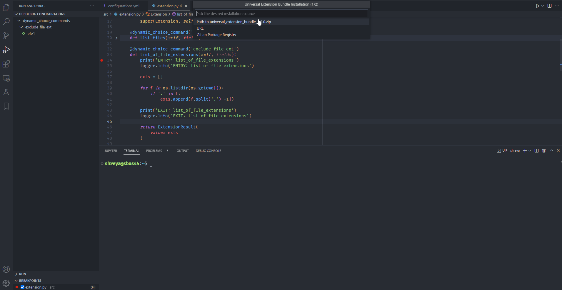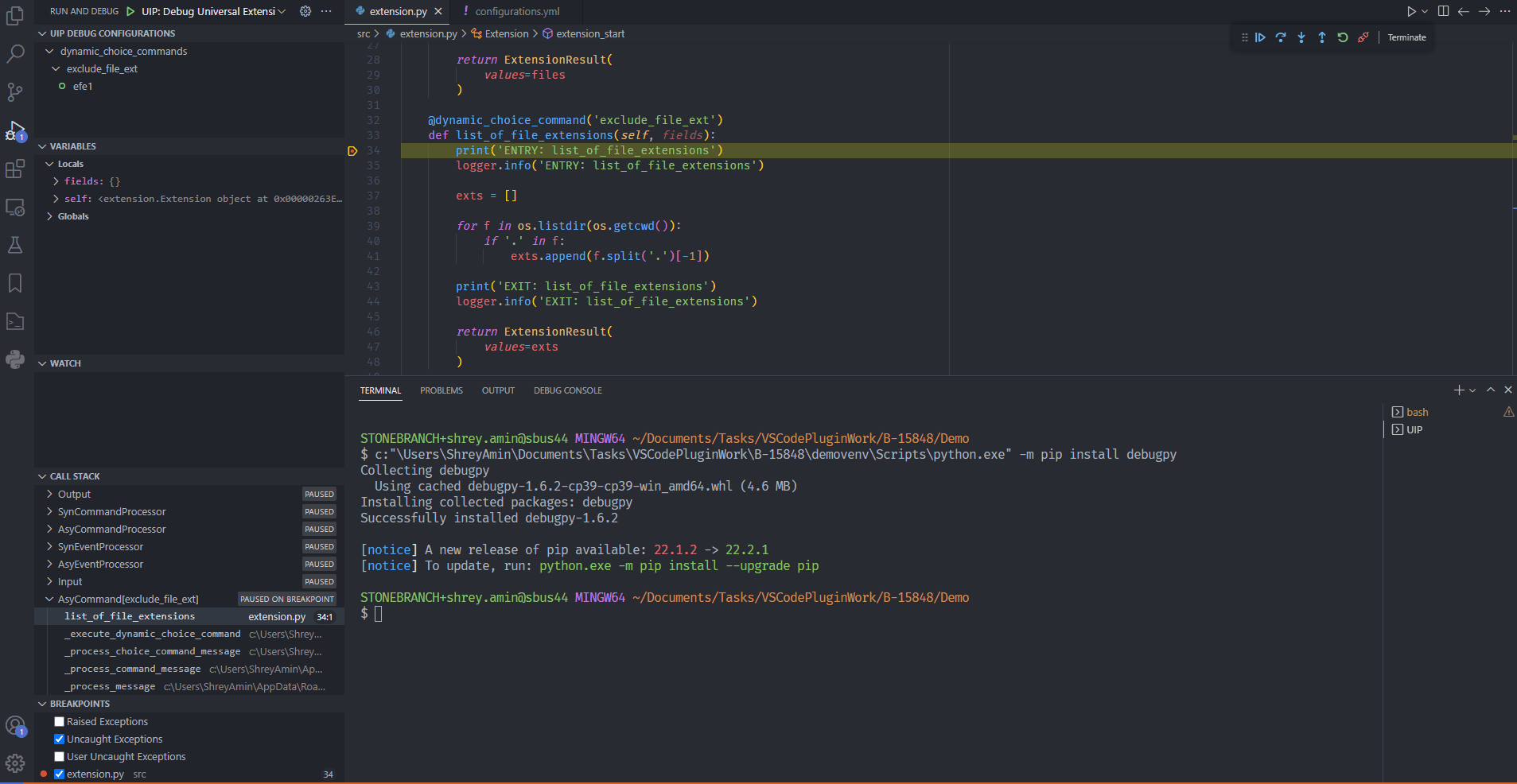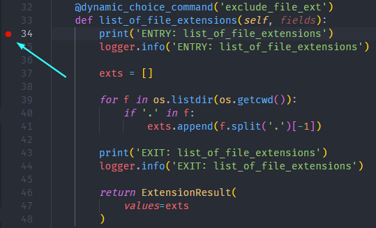 After installing the bundle, the plugin started the debugging session and hit the breakpoint. The following sequence of steps shows how to view the output (in real time) of the exclude_file_ext dynamic choice command: