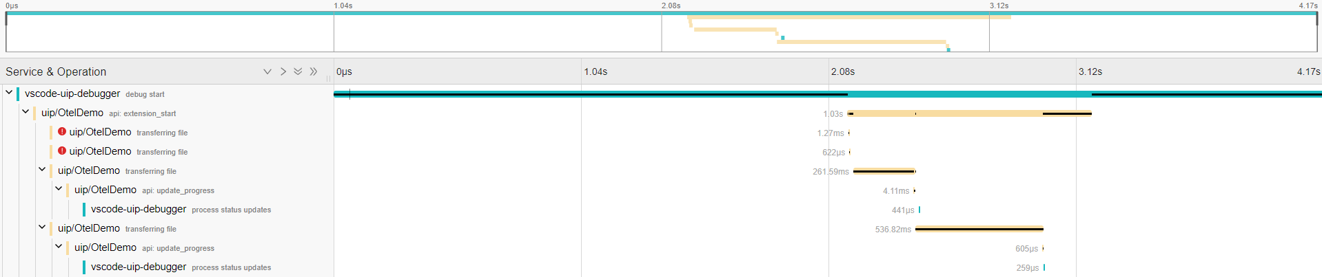 On this page, we will enable and use the Opentelemetry Tracing functionality to get a visual representation of our Extension. Once again, we will use the UIP VSCode Plugin to test our changes, for now.