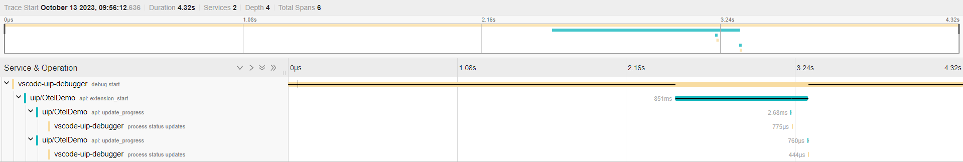 Without modifying the Extension code at all, we have a meaningful way of looking at the Extension instance. Go ahead and inspect the spans (debug start, api: extension_start, etc.) by clicking on them; you will find useful information such as the fields passed into extension_start(), rc, unv_output etc. all consolidated in one place.