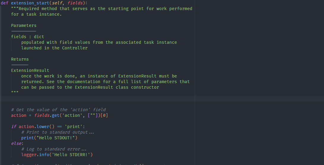 1. Showing the code completion for the fields parameter in extension_start.