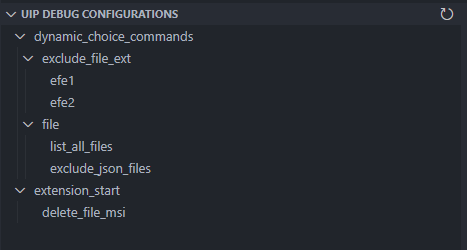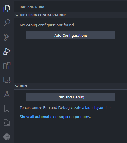 The “UIP DEBUG CONFIGURATIONS” view located in the “Run and Debug” section is responsible for showing all the launchable configurations defined in configurations.yml: