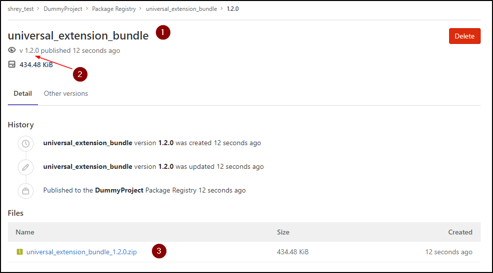 1. Upload the universal_extension_bundle_1.2.0.zip as a generic package to DummyProject's package registry using the steps outline in GitLab Generic Packages Repository | GitLab. If successful, you should see something like this:
