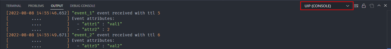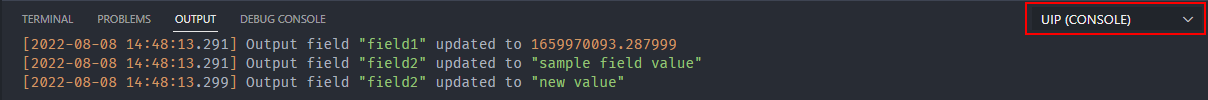As you can see in the figure above, the status of all output only fields (when they are updated) is printed in the UIP (CONSOLE) output channel. UIP (CONSOLE) will update in real-time as the fields are updated.