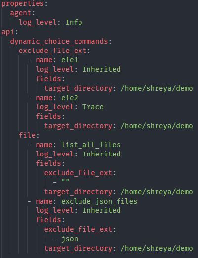 For instance, in the figure below, dynamic_choice_commands consists of the exclude_file_ext and file dynamic choice fields. exclude_file_ext is a dynamic choice field with two debug entries (can have any number of entries >=1) uniquely identified by the name property.