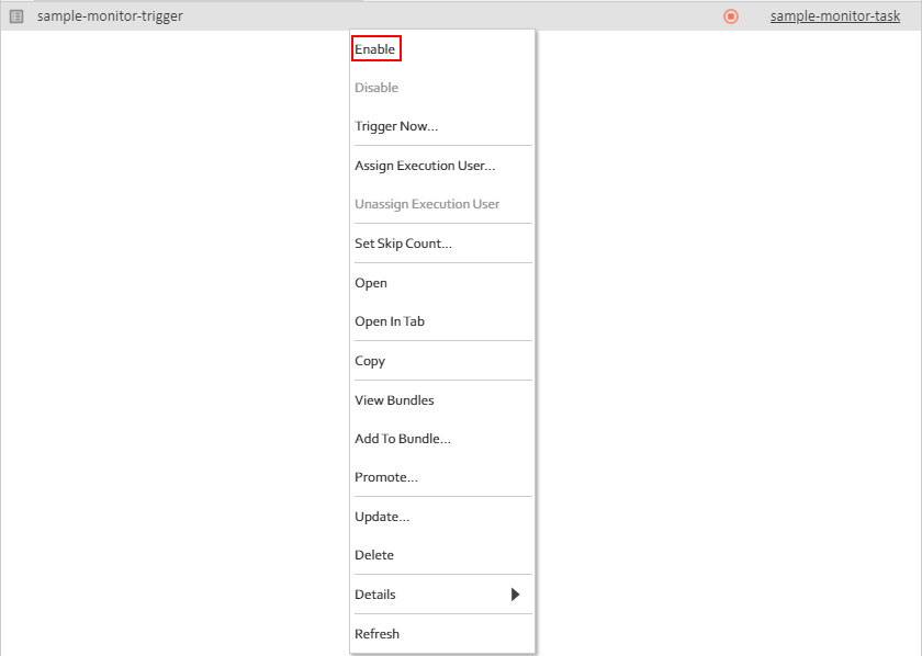 We are finally ready to see the event functionality in action. Navigate to the sample-monitor-trigger, right-click on it, and select Enable:
