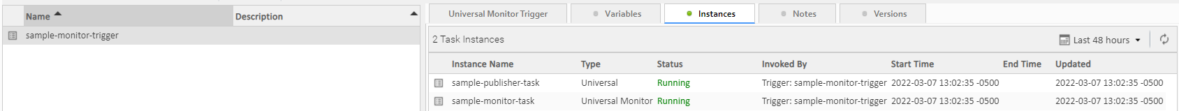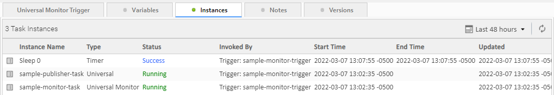 Clicking Enable will launch the sample-monitor-task and sample-publisher-task. To see this, go to the Instances tab of the sample-monitor-trigger. You should see the following: