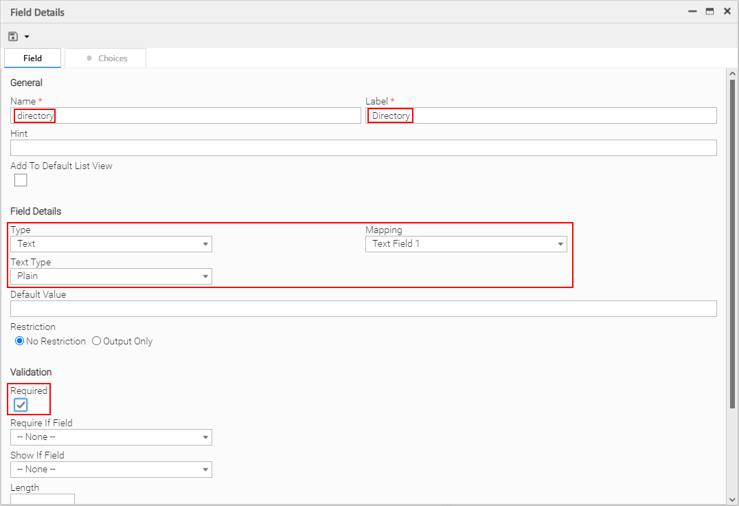 A new attribute of type Text called filelist is added which will contain the list of files (formatted as a string) in the directory specified by the directory field added in the last step.